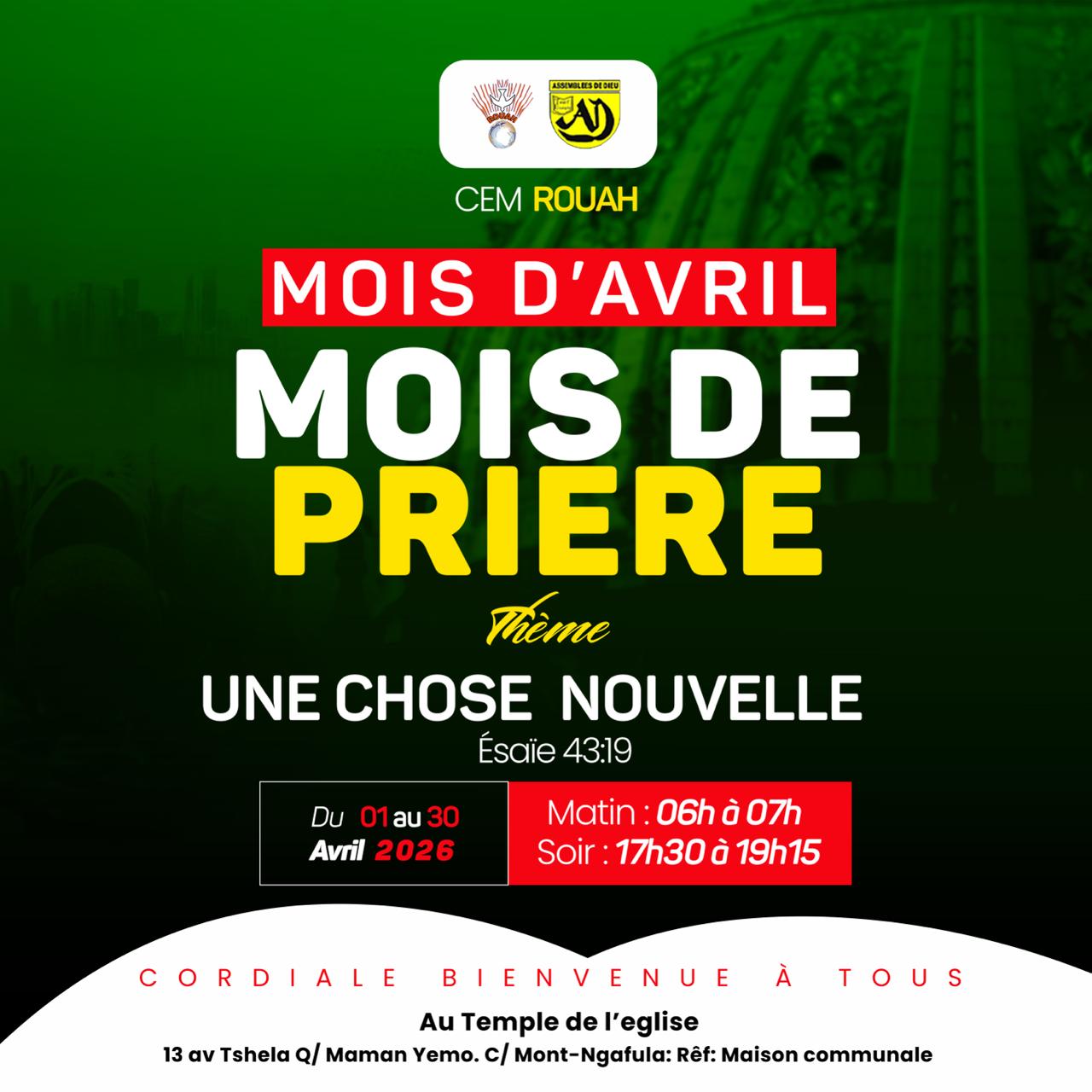 Le CEM ROUAH a la joie de vous inviter à son grand programme du Mois de prière, qui se tiendra du 1er au 30 avril 2026 autour du thème inspirant : « Une chose nouvelle » tiré de Ésaïe 43:19.